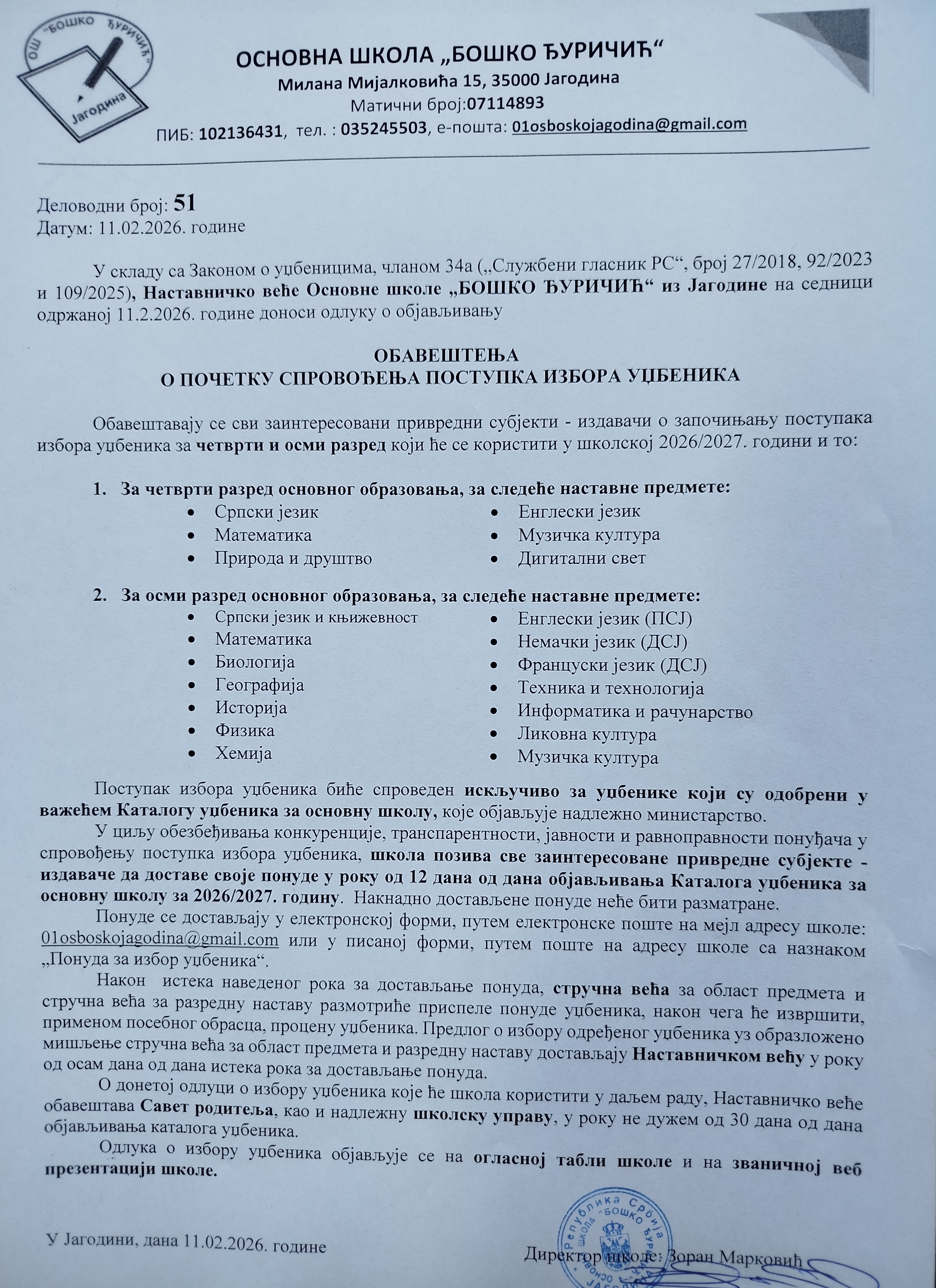 Обавештење о почетку спровођења поступка избора уџбеника